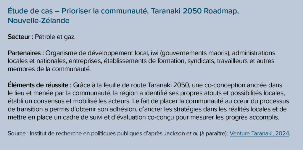 Pour aider les employeurs et les travailleurs des communautĂ©s vulnĂ©rables Ă sâadapter aux transformations structurelles de lâĂ©conomie, les programmes fĂ©dĂ©raux devraient intĂ©grer une approche locale dans les politiques industrielles, incluant des crĂ©dits dâimpĂŽt, des subventions, un approvisionnement et des prĂȘts. Les investissements dans les grands projets doivent ĂȘtre liĂ©s aux compĂ©tences locales, aux infrastructures et aux possibilitĂ©s de propriĂ©tĂ©. Les gouvernements devraient investir dans le renforcement des capacitĂ©s locales afin que les communautĂ©s disposant de ressources limitĂ©es puissent participer Ă la planification et Ă la coordination industrielles. Cette approche concilie compĂ©titivitĂ© et cohĂ©sion, en veillant Ă ce que chaque projet majeur crĂ©e une valeur durable et inclusive pour les populations et les territoires qui lâaccueillent.