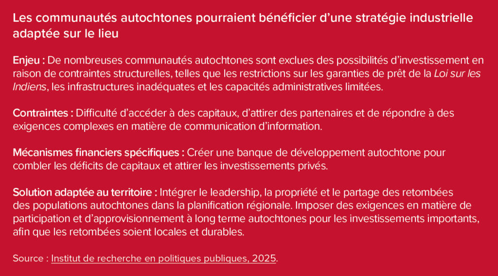 La politique industrielle peut aider les grands employeurs Ă sâadapter aux changements structurels tout en renforçant les bases Ă©conomiques des communautĂ©s. Les communautĂ©s rurales et autochtones risquent de subir tout le poids des transformations Ă©conomiques, tout en Ă©tant confrontĂ©es Ă dâautres dĂ©fis et perspectives que dans les centres urbains. Les leviers de la politique industrielle du Canada restent fragmentĂ©s et axĂ©s sur les projets, favorisant les grands promoteurs disposant de capacitĂ©s administratives.