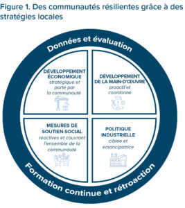Le gouvernement fĂ©dĂ©ral peut mettre en place un continuum de stratĂ©gies â des rĂ©ponses rapides aux renouvellements Ă long terme â qui soit pratique, adaptĂ© au lieu et portĂ© par la communautĂ©, en plus dâĂȘtre conçu et gouvernĂ© conjointement avec les partenaires locaux. Il reposera sur quatre piliers qui se renforcent mutuellement â un dĂ©veloppement Ă©conomique stratĂ©gique menĂ© par la communautĂ©, un dĂ©veloppement des compĂ©tences proactif et coordonnĂ©, des mesures de soutien social adaptĂ©es Ă lâĂ©chelle de la communautĂ©, ainsi quâune politique industrielle ciblĂ©e, adaptĂ©e aux territoires et Ă©mancipatrice â, ces piliers sâappuyant sur un cinquiĂšme traversant tous les autres : un socle de donnĂ©es, dâĂ©valuation et dâapprentissage continu (voir figure 1).