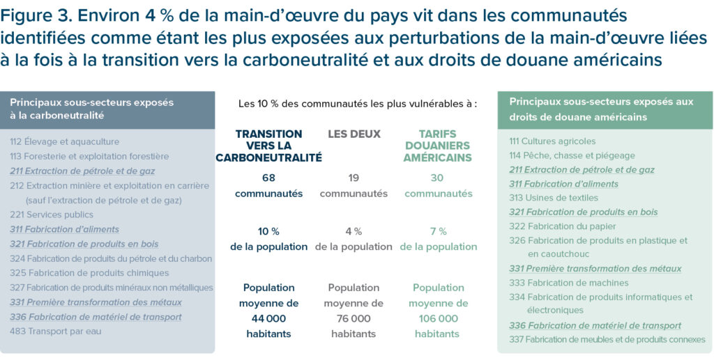 Notes : Le niveau dâexposition dĂ©pend de facteurs sous-jacents propres aux communautĂ©s, tels que la concentration de la main-dâĆuvre dans des secteurs Ă forte intensitĂ© dâĂ©missions ou orientĂ©s vers lâexportation. Il ne repose pas sur les politiques actuelles ou sur celles qui pourraient ĂȘtre adoptĂ©es Ă lâavenir au Canada ou dans dâautres pays. Lâanalyse est fondĂ©e sur les donnĂ©es de 2021. La figure identifie le nombre de divisions de recensement figurant parmi les 10 % les plus Ă©levĂ©s pour au moins un des trois indicateurs de vulnĂ©rabilitĂ© Ă la transition vers la carboneutralitĂ©, et parmi les 10 % les plus exposĂ©s aux tarifs douaniers amĂ©ricains. Pour les besoins de lâanalyse, les communautĂ©s sont dĂ©finies comme des divisions de recensement. Les encadrĂ©s de part et dâautre de la figure identifient les sous-secteurs les plus vulnĂ©rables face aux tarifs douaniers et Ă la transition vers la carboneutralitĂ©. Selon Statistique Canada, les secteurs Ă©conomiques sont dĂ©signĂ©s par des codes Ă deux chiffres du SystĂšme de classification des industries de lâAmĂ©rique du Nord (SCIAN), et les sous-secteurs sont des regroupements de groupes industriels et correspondent Ă des codes Ă trois chiffres.