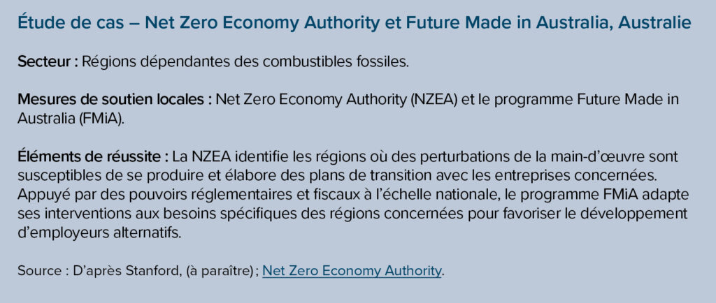 Bien que le Canada offre un large Ă©ventail de mesures de soutien en matiĂšre de formation, dâassurance-emploi et de dĂ©veloppement Ă©conomique rĂ©gional, de nombreux programmes sont conçus pour la population en gĂ©nĂ©ral plutĂŽt que pour rĂ©pondre aux besoins spĂ©cifiques des communautĂ©s exposĂ©es. Des interventions ciblĂ©es et adaptĂ©es au contexte local, qui intĂšgrent le dĂ©veloppement Ă©conomique et celui de la main-dâoeuvre, peuvent contribuer Ă combler cette lacune. La formation professionnelle et le dĂ©veloppement de la main-dâoeuvre sont des leviers essentiels pour permettre des transitions efficaces et Ă©quitables.