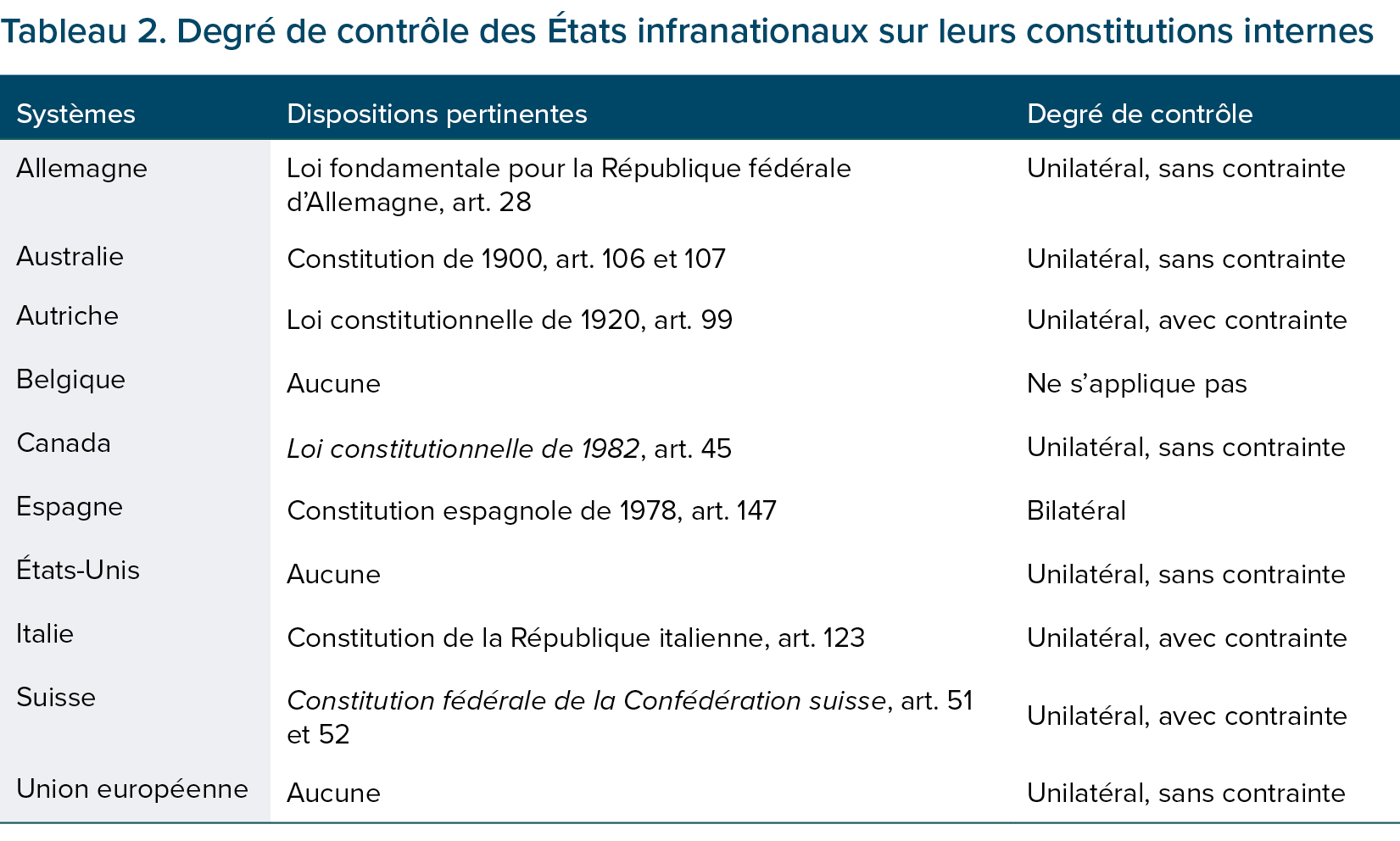 Quant au « pouvoir constituant » des composantes d’un système fédéral, on peut le définir comme « la compétence dont dispose une entité fédérée pour adopter [et modifier], dans le respect des limites fixées par la constitution fédérale, une constitution fédérée, c’est-à-dire un texte caractérisé par une certaine rigidité et doté d’une suprématie par rapport aux autres normes fédérées » (Peiffer, 2017, p. 8). Autrement dit, le pouvoir constituant « interne » d’un État membre est directement relié au degré de contrôle qu’il peut exercer sur la substance de son ordre constitutionnel interne : plus ce degré de contrôle est vaste, plus son pouvoir constituant est important. Le contraire est aussi vrai : plus le degré de contrôle que les États membres d’un système fédéral peuvent exercer sur le contenu de leur propre ordre constitutionnel interne est mince, plus leur pouvoir constituant est limité.