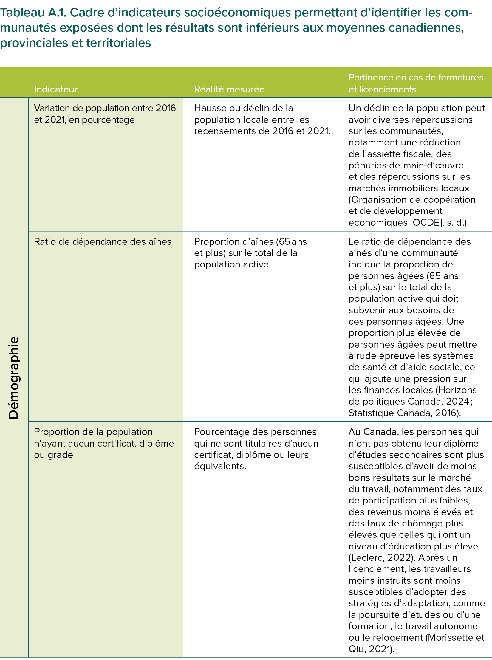 Toutes les communautés exposées méritent notre attention. Nos recommandations peuvent s’appliquer de façon générale aux communautés confrontées à des fermetures ou des licenciements importants. Dans cette note d’information, nous ciblons les communautés où les répercussions risquent d’être les plus graves. Par notre analyse, nous cherchons à évaluer l’ampleur potentielle des perturbations et la capacité d’adaptation d’une communauté. Pour ce faire, nous utilisons certains indicateurs socioéconomiques (voir tableau A.1) afin d’identifier certaines communautés déjà confrontées à des pressions économiques, sociales ou démographiques importantes et exposées aux perturbations du marché de l’emploi. Cela comprend des communautés exposées à la transition vers la carboneutralité et inclut un sous-ensemble plus restreint qui, en plus, est exposé aux changements de la politique commerciale américaine. Pour ces communautés, les licenciements collectifs pourraient amplifier les défis existants et exercer une pression supplémentaire sur l’ensemble de la communauté.