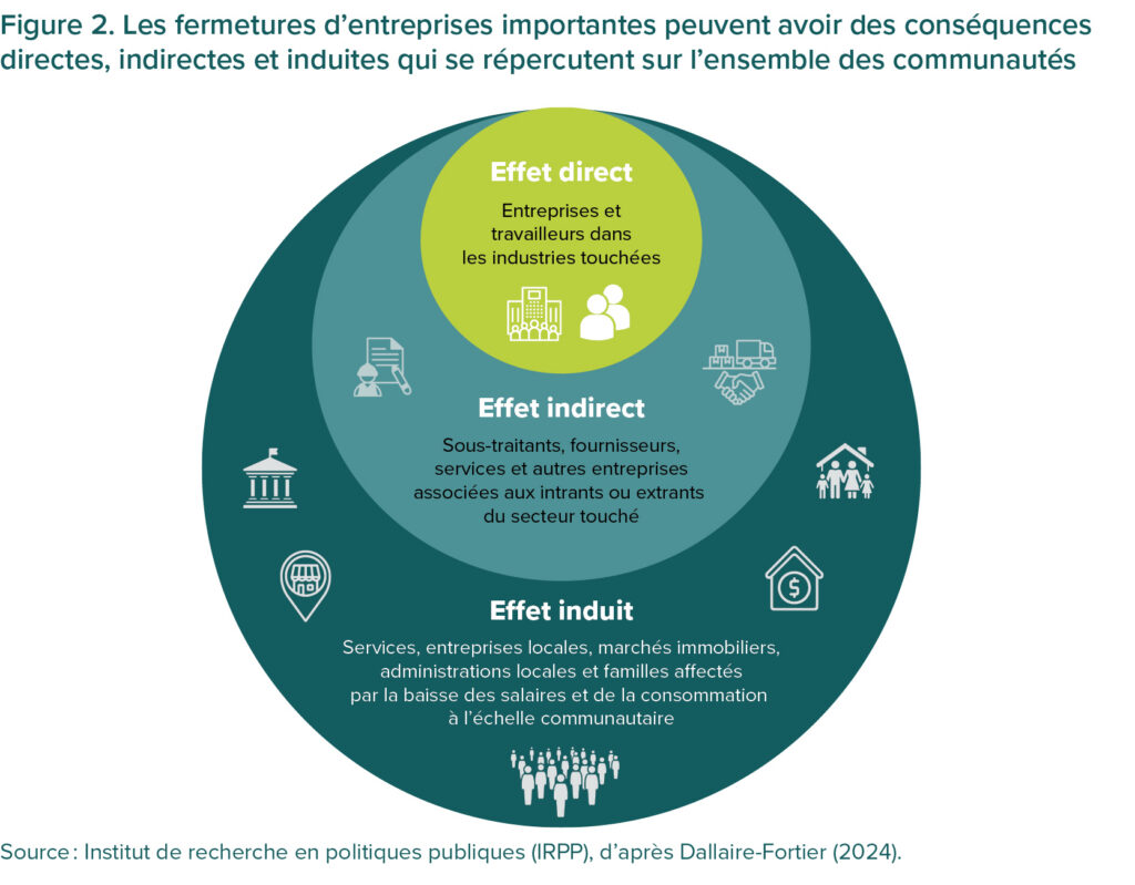 Lorsqu’un employeur important ferme ses portes, cela peut avoir un effet d’entraînement sur l’économie et les chaînes d’approvisionnement locales (OCDE, 2025). La figure 2 montre comment cette incidence peut s’étendre bien au-delà des travailleurs et des employeurs directement touchés. Dans certains cas, la fermeture d’un établissement entraîne des perturbations indirectes, comme des pertes d’emplois et un déclin plus général dans les chaînes d’approvisionnement connexes et d’autres secteurs de l’économie locale. Les licenciements causent également des retombées induites : en réduisant les revenus des ménages ainsi que leurs dépenses en alimentation, en services et en logement, ils affaiblissent la demande de biens et de services dans l’ensemble de la communauté (Dallaire-Fortier, 2024).