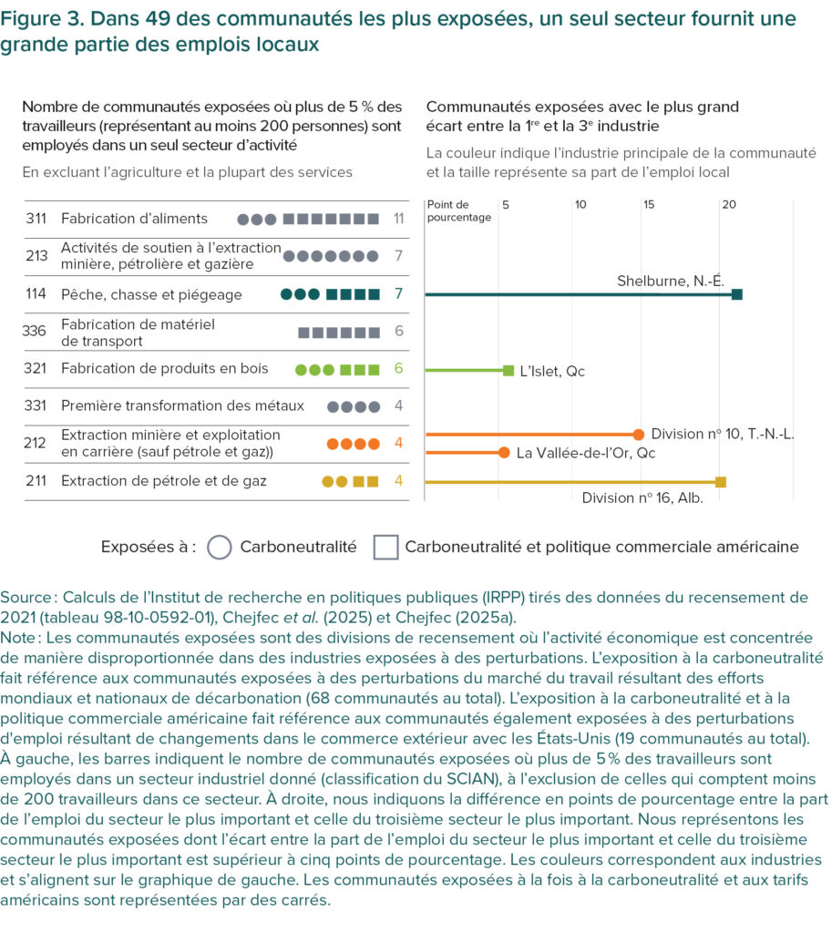 Dans les petites collectivités isolées qui dépendent souvent d’un seul secteur d’activité ou d’un seul employeur, une fermeture ou un licenciement important peut avoir des répercussions plus marquées à l’échelle de la collectivité (Bruce et al., 2005). La figure 3 montre comment cette dépendance est fréquente dans les collectivités exposées à la transition vers la carboneutralité, incluant celles qui sont en plus exposées aux changements dans la politique commerciale américaine.