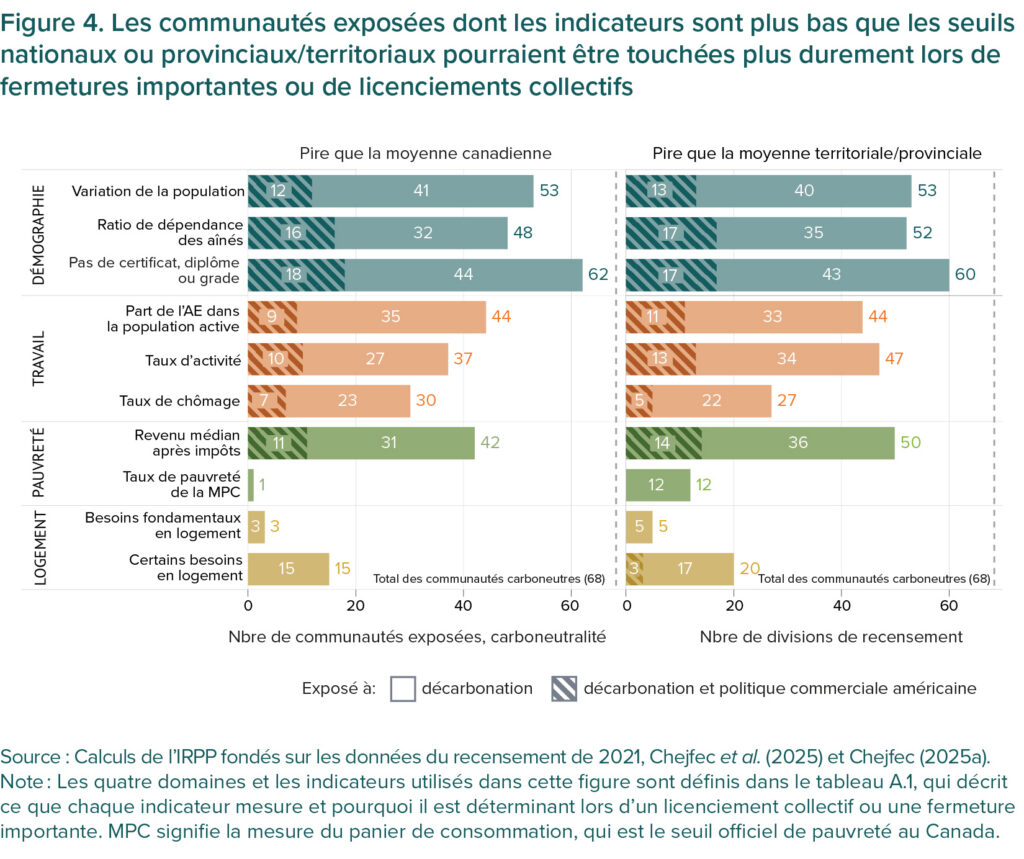 Les communautés plus exposées aux perturbations du marché de l’emploi liées à l’objectif de carboneutralité sont, en moyenne, moins peuplées, plus éloignées géographiquement et moins diversifiées sur le plan économique que les autres. Leurs travailleurs ont tendance à être plus âgés, à avoir moins fait d’études postsecondaires et, dans certains cas, à faire davantage partie de communautés autochtones (Jackson et al., 2025 ; Samson et al., 2025).