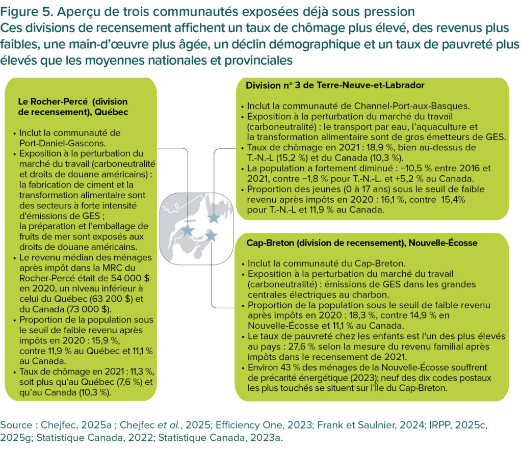 Les profils des communautés exposées établis par l’IRPP révèlent qu’elles ont tendance à être, en moyenne, plus petites, plus éloignées et moins diversifiées sur le plan économique que les communautés non exposées. Cela montre à quel point il peut être difficile d’attirer et de retenir des travailleurs qualifiés. Ces difficultés sont souvent dues à des lacunes dans les infrastructures, les équipements et les services locaux, notamment en ce qui a trait au logement, aux soins de santé, au transport, aux écoles, aux services de garde, à l’accès Internet et à la téléphonie mobile (IRPP, 2025a, 2025b, 2025c, 2025d, 2025e). La figure 5 présente trois divisions de recensement qui abritent des communautés exposées dont le profil a été détaillé par l’IRPP. En raison de leurs conditions socioéconomiques défavorables, ces endroits font partie des communautés exposées présentées dans la figure 4.