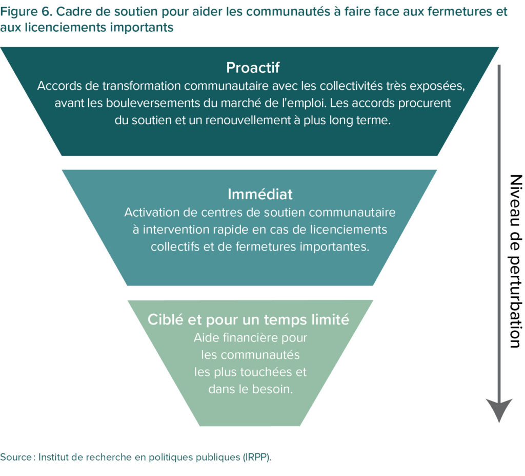 Ensemble, ces recommandations forment un cadre de soutien à trois niveaux. Les accords de transformation communautaire établiraient une fondation à plus long terme pour les communautés exposées, les centres de soutien communautaire à intervention rapide apporteraient une aide immédiate et concrète aux personnes touchées par des licenciements et des fermetures importantes, et une aide financière ciblée serait accordée en cas de difficultés financières graves dans une communauté. Des déclencheurs précis activeraient chacune de ces mesures afin qu’elles correspondent à différents niveaux de besoins dans la communauté (voir figure 6).