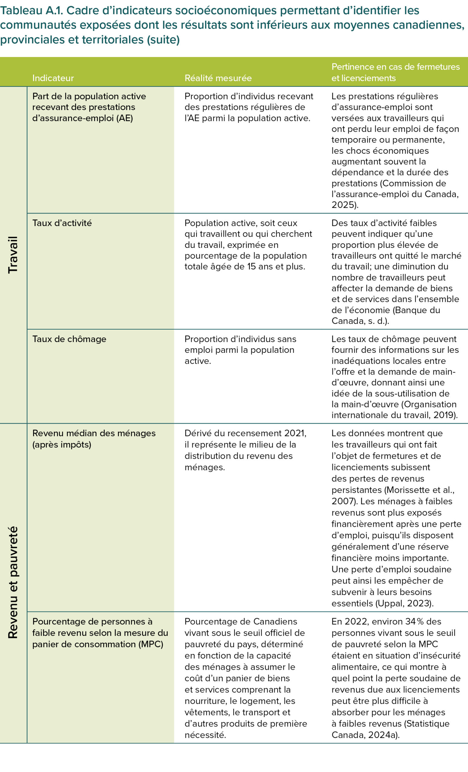 Toutes les communautés exposées méritent notre attention. Nos recommandations peuvent s’appliquer de façon générale aux communautés confrontées à des fermetures ou des licenciements importants. Dans cette note d’information, nous ciblons les communautés où les répercussions risquent d’être les plus graves. Par notre analyse, nous cherchons à évaluer l’ampleur potentielle des perturbations et la capacité d’adaptation d’une communauté. Pour ce faire, nous utilisons certains indicateurs socioéconomiques (voir tableau A.1) afin d’identifier certaines communautés déjà confrontées à des pressions économiques, sociales ou démographiques importantes et exposées aux perturbations du marché de l’emploi. Cela comprend des communautés exposées à la transition vers la carboneutralité et inclut un sous-ensemble plus restreint qui, en plus, est exposé aux changements de la politique commerciale américaine. Pour ces communautés, les licenciements collectifs pourraient amplifier les défis existants et exercer une pression supplémentaire sur l’ensemble de la communauté.