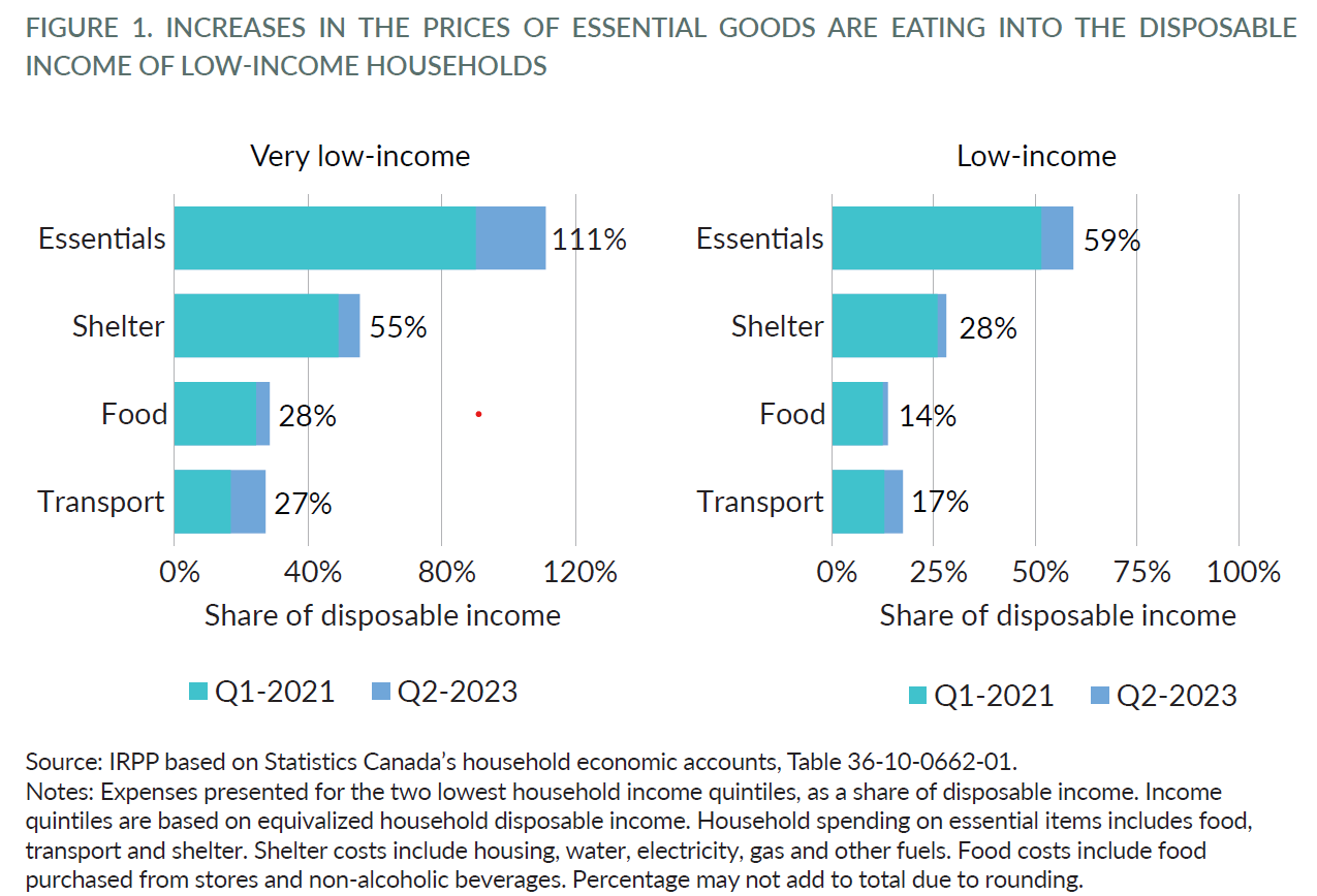 Rising prices are an affordability challenge for many Canadians, but for households with low incomes, they are a matter of survival. Figure 1 shows that very low-income families (the lowest 20 per cent of earners) spend more than 100 per cent of their disposable income on shelter, food and transport.