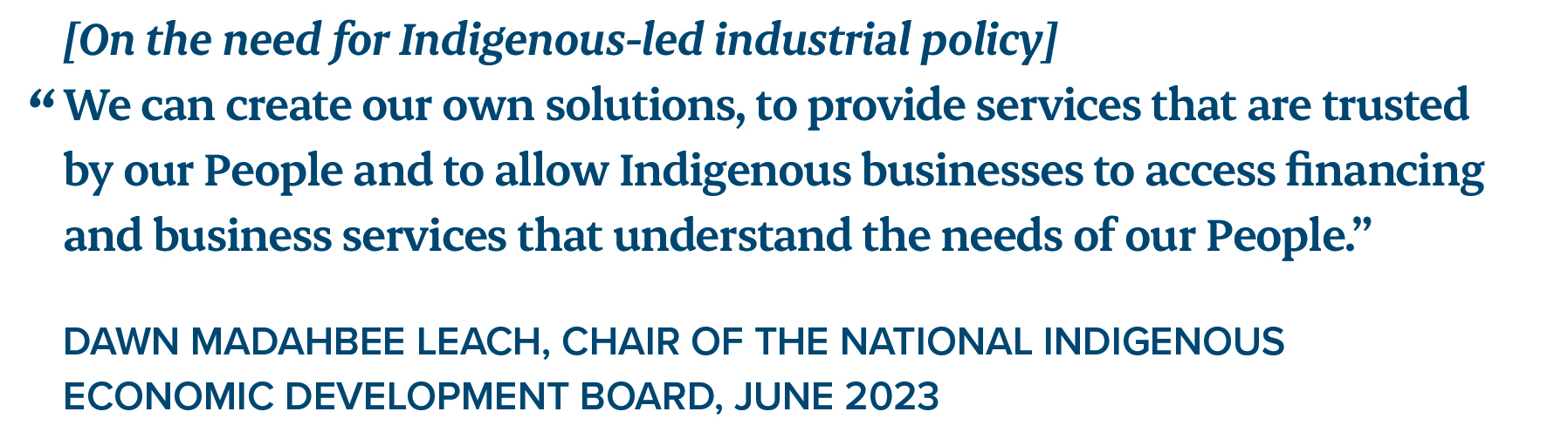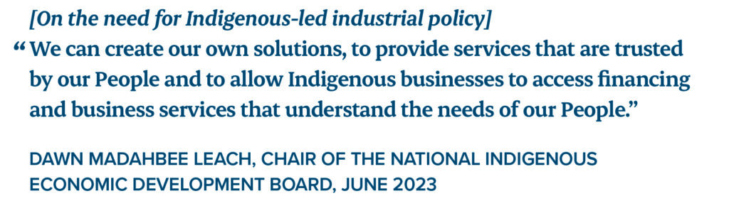 Industrial policy can help accelerate Indigenous-led economic growth by improving access to capital and procurement opportunities for Indigenous communities and businesses. Recent examples such as the Canada Indigenous Loan Guarantee Corporation and the Canada Infrastructure Bank’s Indigenous Equity Initiative show that industrial policies can play a role in addressing capital constraints (CDEV, 2025b; CIB, 2023a). Innovation in industrial policy can also help to improve the well-being and economic capacity of Indigenous communities by catalyzing investments in infrastructure and removing other barriers to Indigenous economic participation. Of course, these efforts will need to be made in concert with broader reforms.