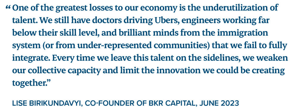 Inclusion regardless of gender and race is essential to this vision. Members of under-represented groups, particularly Black entrepreneurs, often face unique and persistent barriers such as discrimination and limited access to capital. Addressing these systemic challenges requires targeted measures, such as the federal Black Entrepreneurship Loan Fund, which works to close financing gaps and level the playing field for Black business owners (FACE, 2025; Ratté & Galliot, 2025). Removing these obstacles is not just a matter of fairness – it taps into talent and perspectives that can fuel broader economic and social innovation.