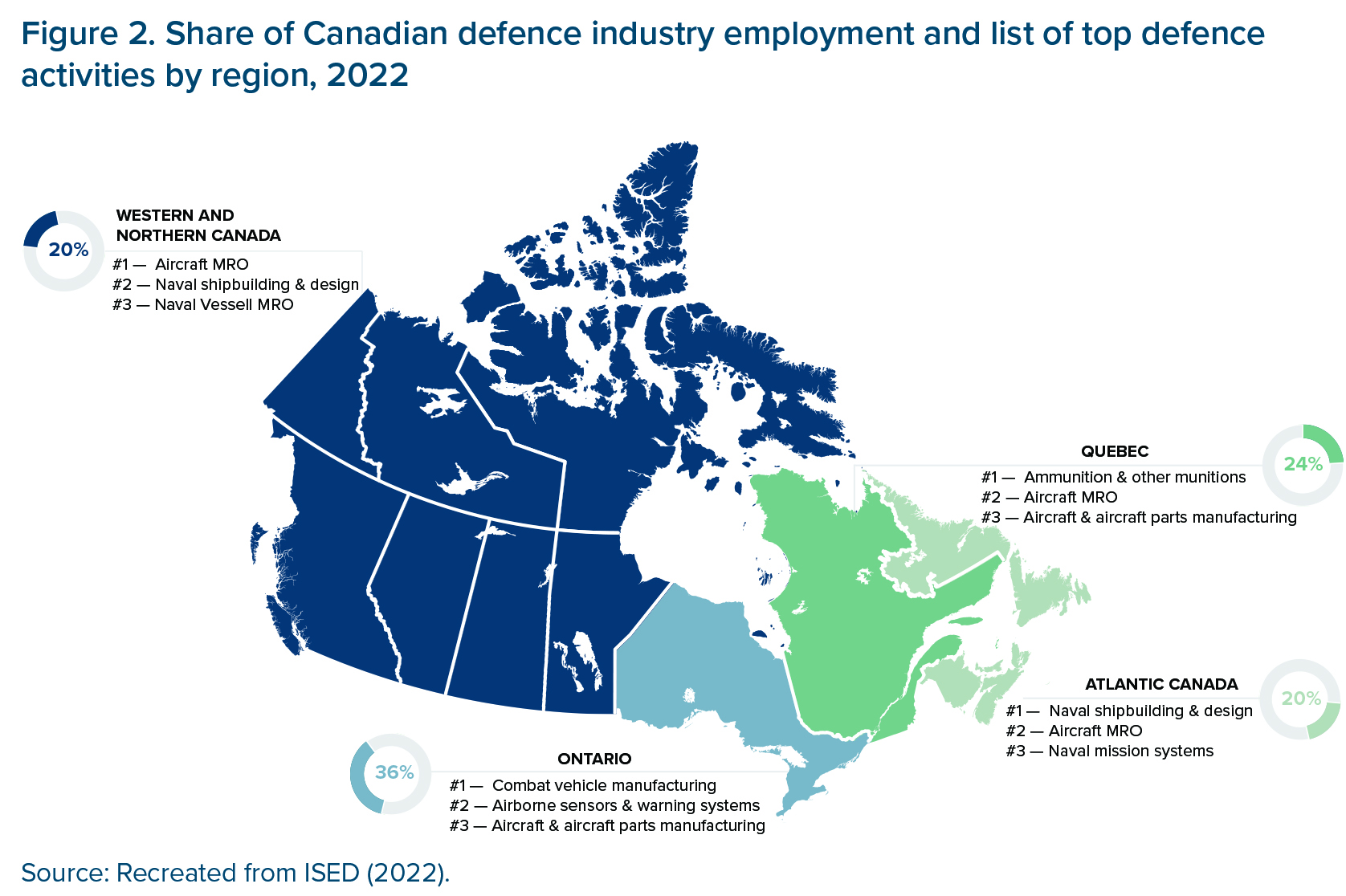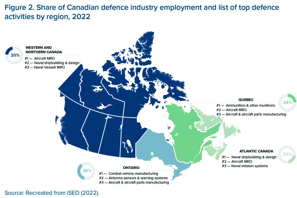 Given that the pledge entails a massive increase in expenditures, it is important that the government focus on generating significant economic and societal benefits within Canada. Part of this can be achieved through the “dual use” objective, where a northern road and port, for example, are used for both defence and local economic development. The other part can be achieved by using spending to strengthen Canada’s defence production capacity and domestic supply chains. In 2022, the Canadian defence industry reported over $14.3B in revenues from nearly 600 firms (ISED, 2022). Prime Minister Mark Carney has promised to prioritize made-in-Canada manufacturing and supply chains, shifting away from an approach that led to an estimated three-quarters of Canada’s defence capital spending going to the United States (Canadian Press, 2025).