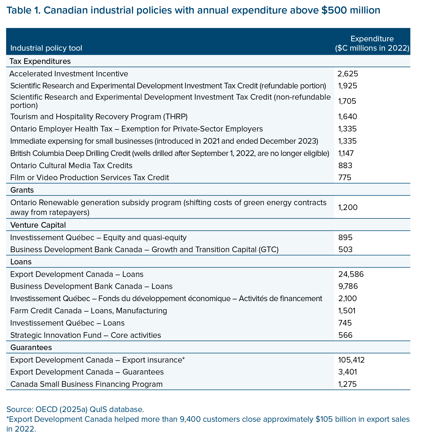 Canada has many industrial policies at the federal, provincial, territorial and municipal levels of government. An overview of the largest federal and provincial industrial policies included in the OECD’s Quantifying Industrial Strategies (QuIS) database for Canada reveals a significant reliance on tax expenditures as well as loans and guarantees (table 1). In comparison with other OECD countries, Canada tends to rely more on export insurance and guarantees that primarily benefit manufacturers (OECD, 2023).