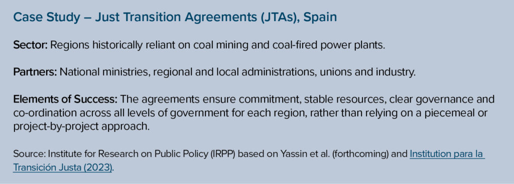 Because many proposed major projects will take place in and around rural or remote communities, governments can work with relevant organizations to ensure accessible skills training and tailored wrap-around social supports are in place. For communities that want it, these partnerships could form the basis of long-term, co-designed and co-led community transformation agreements (such as in the case study, “Just Transition Agreements [JTAs], Spain”).