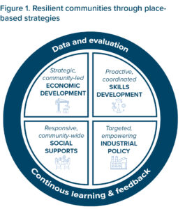 The federal government can build a continuum — from rapid response to long-term renewal — that is practical, place-based and community-led, as well as co-designed and co-governed with local partners. This continuum hinges on four mutually reinforcing pillars — strategic, community-led economic development; proactive, co-ordinated skills development; responsive, community-wide social supports; and targeted, empowering place-based industrial policy — supported by a fifth pillar of data, evaluation and continuous learning that cuts across the others (see figure 1).