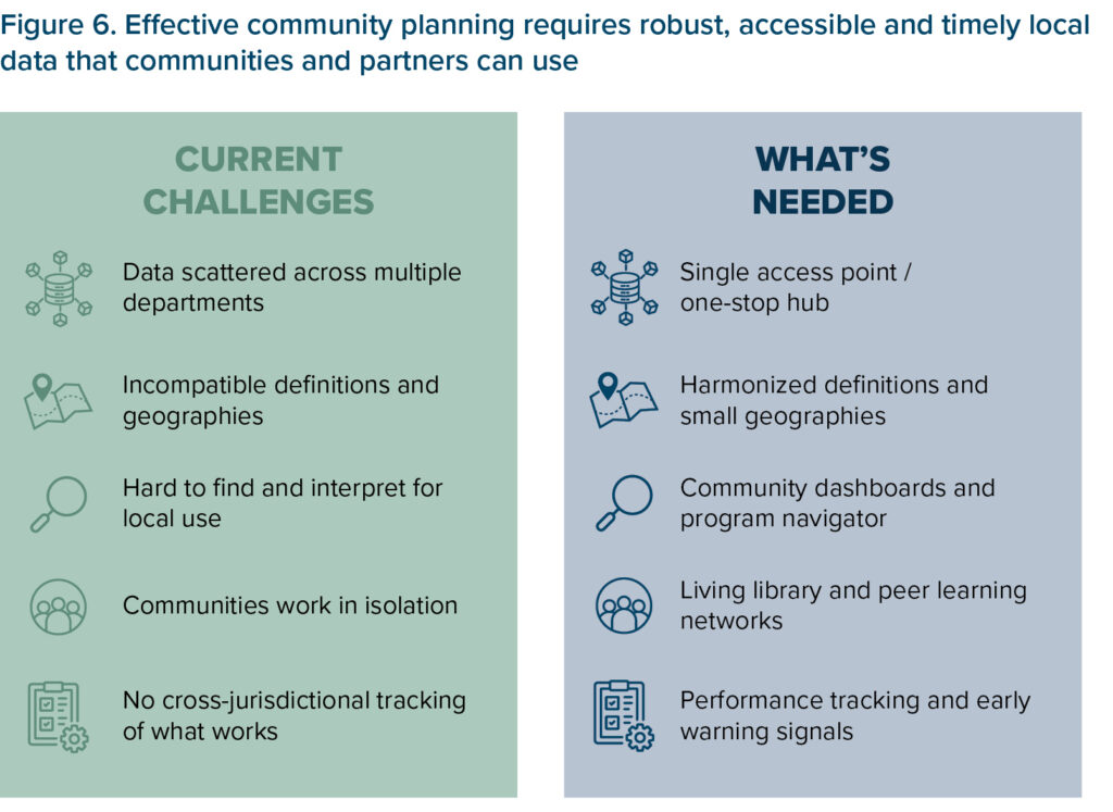 Effective community planning in an environment of economic change requires synthesizing complex and cross-sector information, including exposure to disruption across industries, demand forecasts for emerging occupations and skills, the capacity, accessibility and quality of local training pathways, documented outcomes and lessons from comparable communities, and the eligibility and take-up of support programs. Yet this information is fragmented across federal departments (ESDC, NRCan, ISED, etc.) and Statistics Canada surveys, which use distinct methodologies and definitions that are difficult to reconcile. Susceptible communities, which are often under-resourced and capacity-constrained, are left to navigate technical challenges and scattered data sources at a time when they need to focus on strategic economic transformation plans. Figure 6 summarizes these challenges and the key data co-ordination needs required to support communities.
